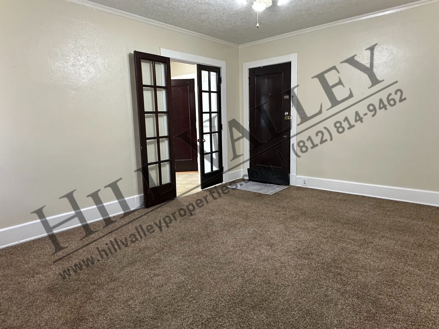Nestled less than a mile from ISU's campus and Downtown Terre Haute, this upper-level one bedroom apartment is full of charm and functional design. The living room welcomes you with carpeted flooring and a ceiling fan, setting the stage for a warm and inviting space. Through the french doors, you'll find a bonus pass-through area with a built-in storage cabinet, ideal for a cozy dining nook or creative corner. The carpeted bedroom features a spacious closet for storing your belongings, while the kitchen is equipped with a refrigerator and gas stove to meet your cooking needs. Best of all, the utilities are covered by the owner, making the rent your only monthly expense!
